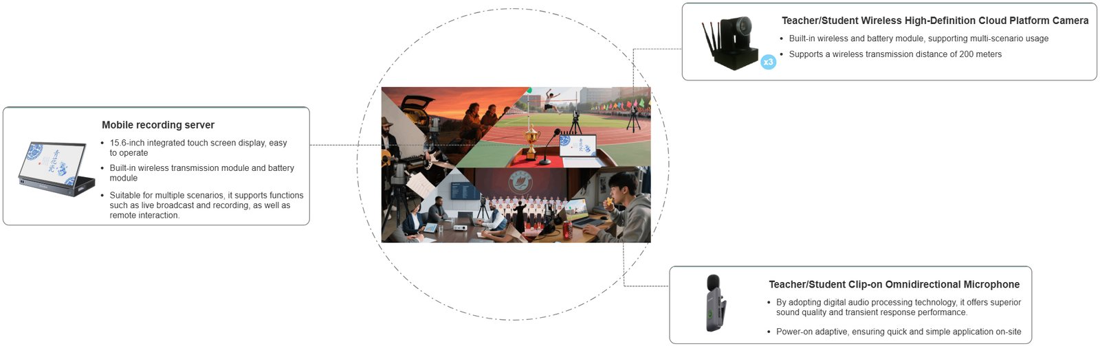 Centered on a wireless portable recorder, this solution offers all‑wireless transmission, case‑style packing, and five‑minute setup—delivering full‑HD recording and large‑scale streaming in almost any setting. For pop‑up events or constrained venues, a mobile recorder with wireless PTZ cameras and mics builds the scene quickly. Flexible deployment, easy operation, auto‑tracking, and smart switching fit festivals, sports meets, and other campus events.