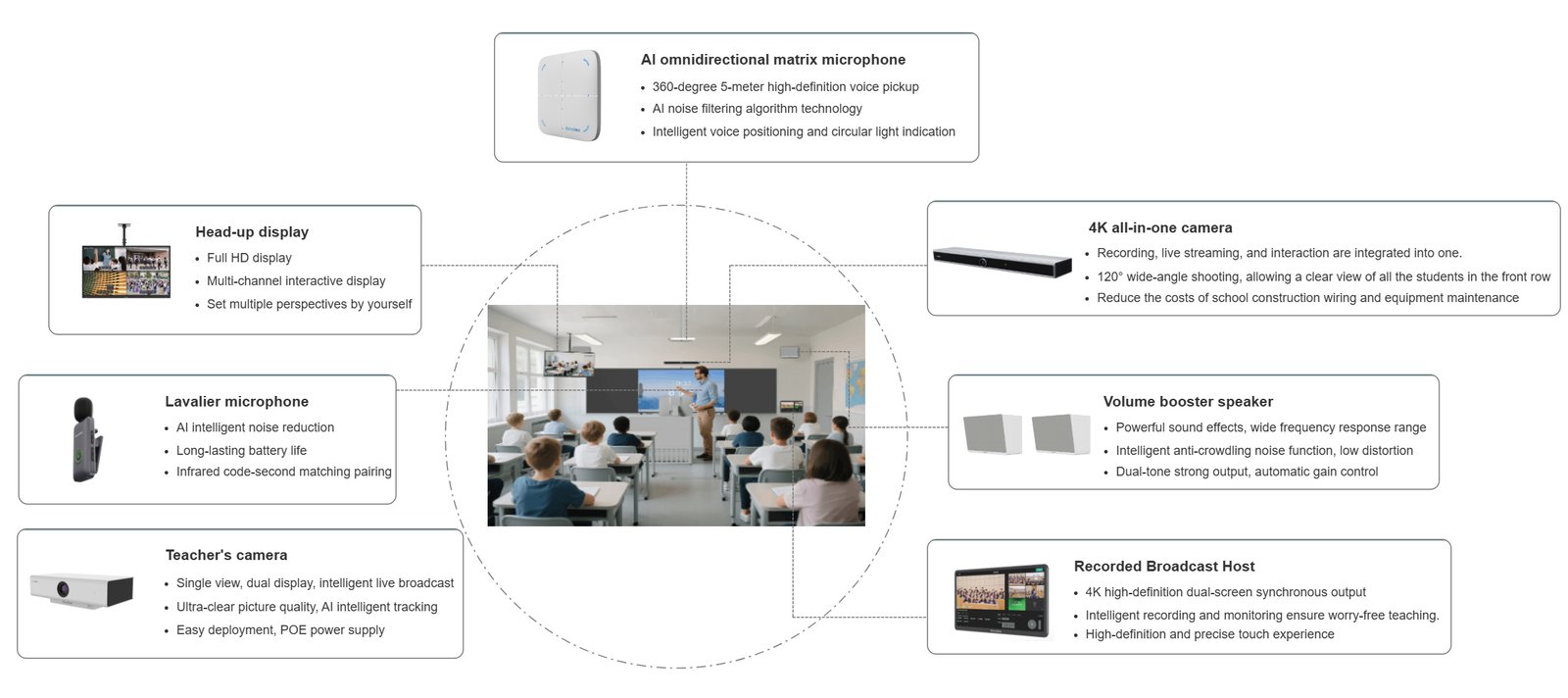 This solution uses advanced capture to record full lessons and enable real‑time interaction, improving quality and efficiency. With HD cameras, audio capture, smart switching, and cloud storage, it delivers a complete, efficient, easy‑to‑use setup. Beyond the tech, it centers on real classroom needs so teachers can focus on teaching rather than operations.